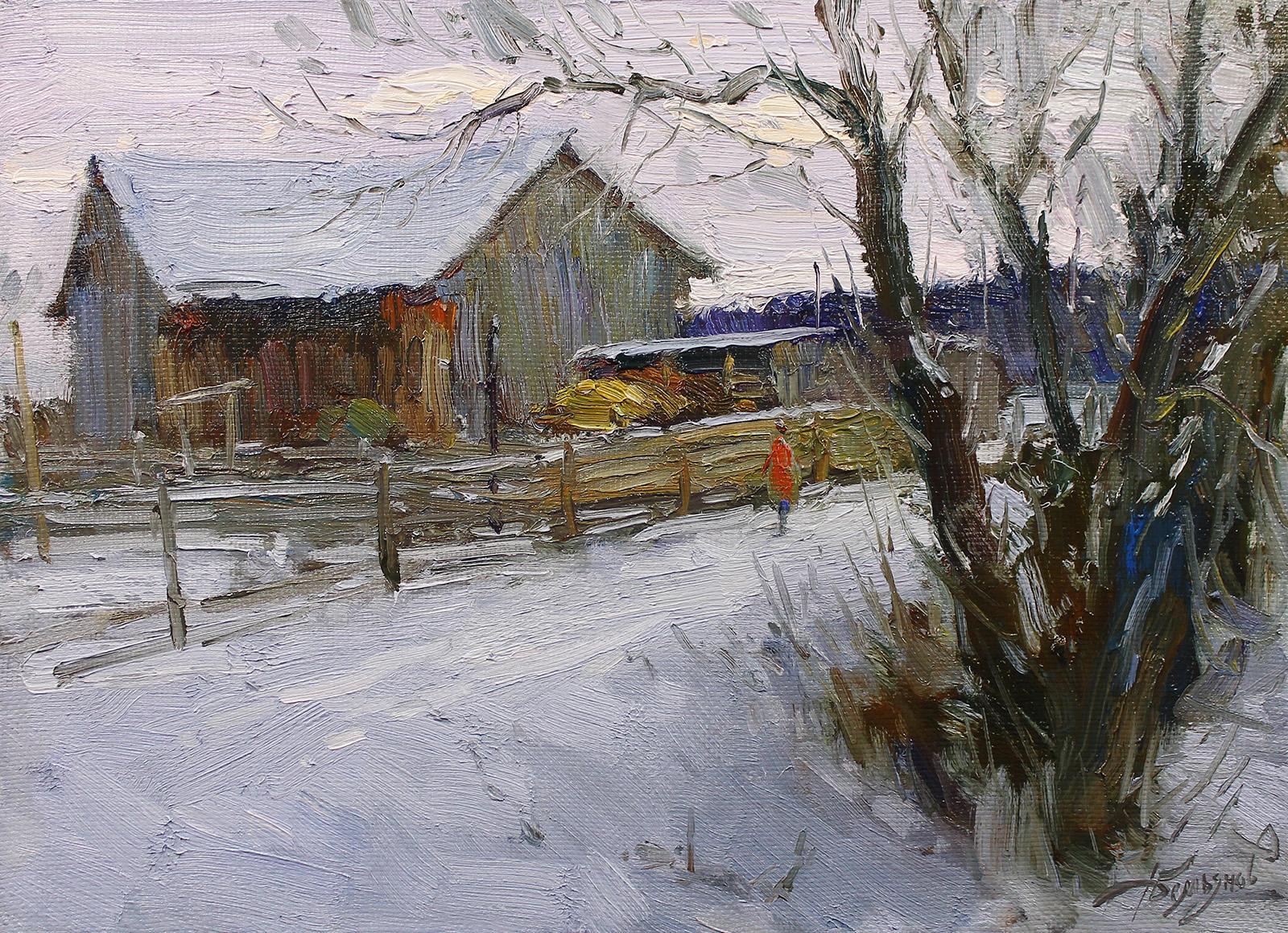 Хруст снега под ногами и карканье одинокой птицы, летящей над головой, это звуки зимнего пейзажа на пленэре вдали от шумных дорог. Скромность цвета в снежной гамме нарушают лишь сочные мазки охры на шуршащей соломе да подкрашенные сгустками красного кадмия деревянные стены сеновала. Но вдруг из-за забора выезжают верхом на белой и гнедой лошадях две юные грации.